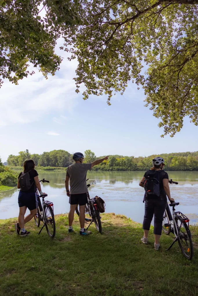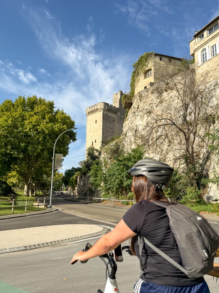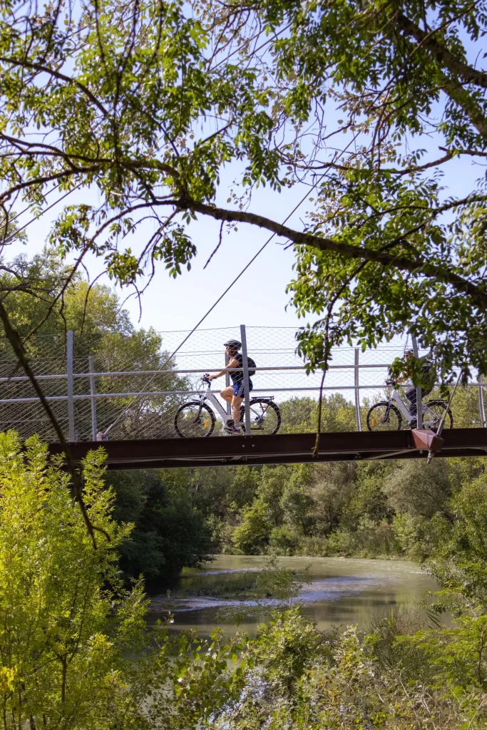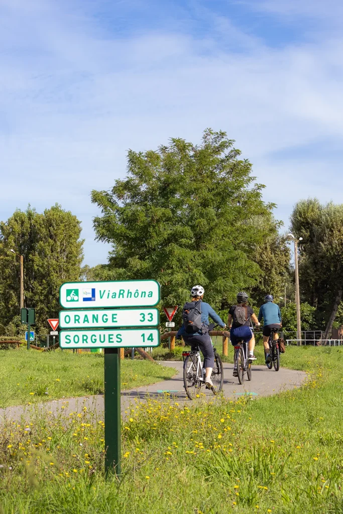 Nous voilà partis à vélo sur la version sportive de 53 kilomètres au départ de Villeneuve lez Avignon vers le Pays des Sorgues. L’itinéraire débute sur la ViaRhôna, qui longe paisiblement le Rhône. En chemin, nous croisons quelques péniches, admirons la Tour Philippe-le-Bel et franchissons la passerelle de l’Oiselay, élégamment aménagée pour les cyclistes et les piétons.
